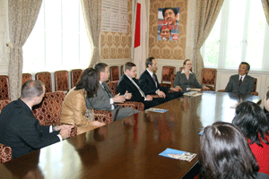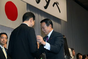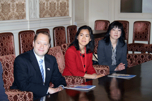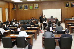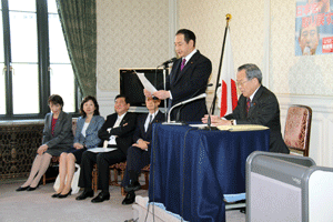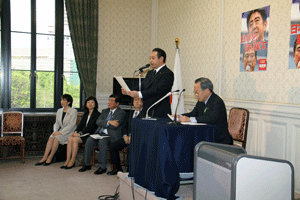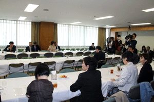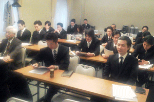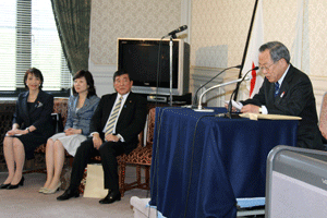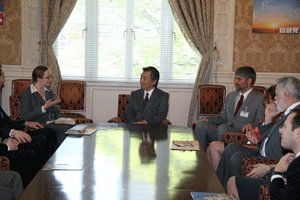 毎年恒例の米国国務省日本語研修所の皆さんが国会見学にお見えになり、院内自民党総裁室で懇談会を開きました。ジョン・マーハー所長はじめ11名の研修生が参加されました。私からは薬剤師である私が厚生労働委員長として取り組んでいる社会保障制度の確立や麻生太郎政権のときに実感した日米関係の重要性、安倍政権の経済政策などをご報告しました。研修生を代表してジェニファー・ハーハイ政治部副部長から「私たちは昨年8月から研修生として横浜で日本語を学んできました。横浜の人達には日本の歴史、文化、美味しい日本料理などたくさんの事を教えていただき感謝しています。今年の2月に安倍総理がアメリカに来てオバマ大統領と会談され日本が最もアメリカと近しい国と認識しアメリカ国民の間にもますます友情が深まったと思います。日米二国間のパートナーシップを深めるためにも私たちは日本の政治制度をもっと知る必要があると思います。今日はありがとうございました」と挨拶がありました。研修生の皆さんは7月に日本大使館や各地の領事館に赴任されるとの事です。皆さんの活躍をお祈りします。