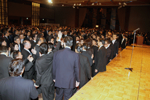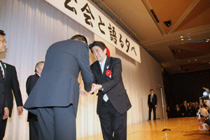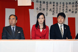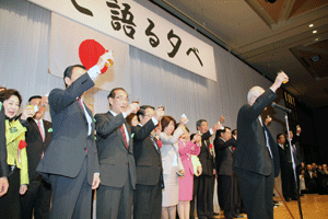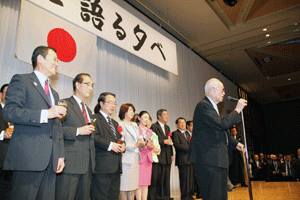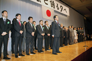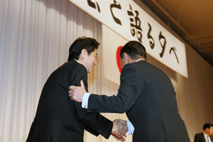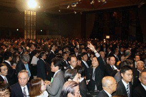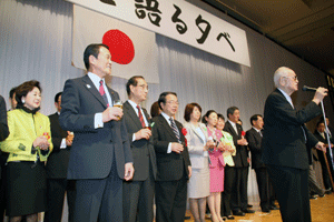 大会決議 恒例の憲法記念日を迎えるに当たり、本年も、ここに「新しい憲法を制定する推進大会」を開催し、各界各層、また全国各地から大勢の同志が参集した。 本年の大会は特別の意義を持つ大会になった。 即ち、昨年末に新しく安倍内閣が誕生したことである。 安倍首相は憲法改正に対する強い意欲を公式の場でも度々表明し、これを受けて、憲法改正の動きが各方面に広がっている。しかも憲法改正について具体的な戦略が論じられるようになってきている。 まことに歓迎すべき動きである。 これを機に新しい憲法を制定する意義についての国民的理解が大きく広まることを願って、我々としての運動を力強く展開していきたいと思う。 ここに新しい決意のもとに、新しい憲法を制定することに向けて尚一層の努力を尽くしていくことをお互いに誓いあうものである。 以上決議する。