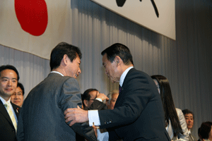中曽根康弘元総理が会長を務める新憲法制定議員同盟主催の「平成25年度新しい憲法を制定する推進大会〜『自立と共生』に向けて〜」が、午後4時から、憲政記念館講堂で開催されました。柳本卓治事務局長の司会により進行されました。今年で6回目になる大会では、第1部で、森本敏前防衛大臣から「日本の安全保障と憲法問題」、田久保忠衛杏林大学名誉教授から「なぜ今我々は憲法を改正しなければいけないのか」と題してそれぞれ記念講演が行われました。また、第2部では、来月95歳になる会長中曽根康弘元総理の挨拶の後、各党政党代表と各種団体のあいさつに続いて大会決議が行なわれました。自民党からは石破茂幹事長が出席し挨拶をしました。新憲法制定議員同盟は、昭和30年7月に結成された「自主憲法期成議員同盟」が前身で、平成17年3月に現在の名称に改称されたとのことです。現在わが党の衆参国会議員ら165人が所属しており、新憲法制定の実現に向けて定期的に勉強会を重ねているとのことです。推進大会を開くことにより国民の意識高揚に努めています。