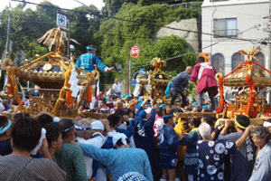 富岡八幡宮秋季大祭も大詰めの「各町大みこし渡御」が行われ、富岡地区七ヶ町の大みこしが京急富岡駅前に勢揃いしました。駅前は見物客の皆さんで溢れ、各町のみこし合わせが賑やかに「セイヤー、セイヤー」の掛け声の中行われ秋季大祭のクライマックスを迎えました。終始好天に恵まれた今年の富岡八幡宮秋季大祭を各町の皆さんは大いに楽しまれていました。(秘書森報告)