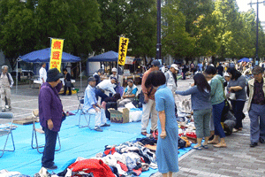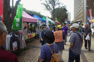 大通り公園チャリティーバザーが大通り公園「石の広場」に於いて催され激励にお邪魔しました。今日は秋晴れの素晴らしい天候の中の開催になりました。このバザーは「共に生きるふれあいバザー」主催による福祉バザーです。このイベントの収益は福祉活動資金になります。中区肢体障害者協会の皆様も朝早くから準備され多くの来場者で賑わっていました。(秘書大木報告)