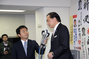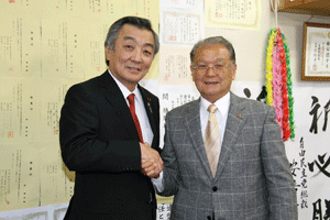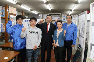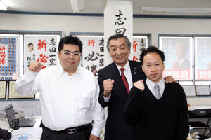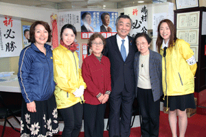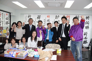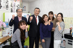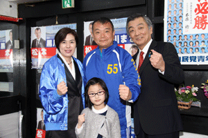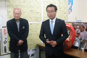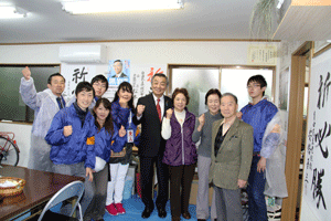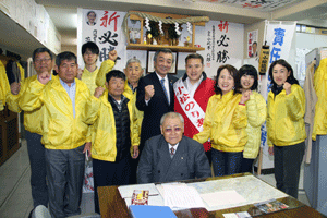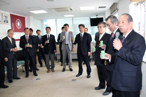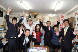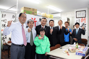 伊波俊之助市会議員選挙候補の出陣式が伊波俊之助事務所で執り行われました。伊波洋之助前市議から子息俊之助候補へタスキが掛けられ、藤木幸夫横浜港運協会会長の応援演説がなされました。全員で勝つぞコールがなされ、俊之助候補は宣伝車に乗り込み街頭遊説に向かいました。(秘書古正報告)